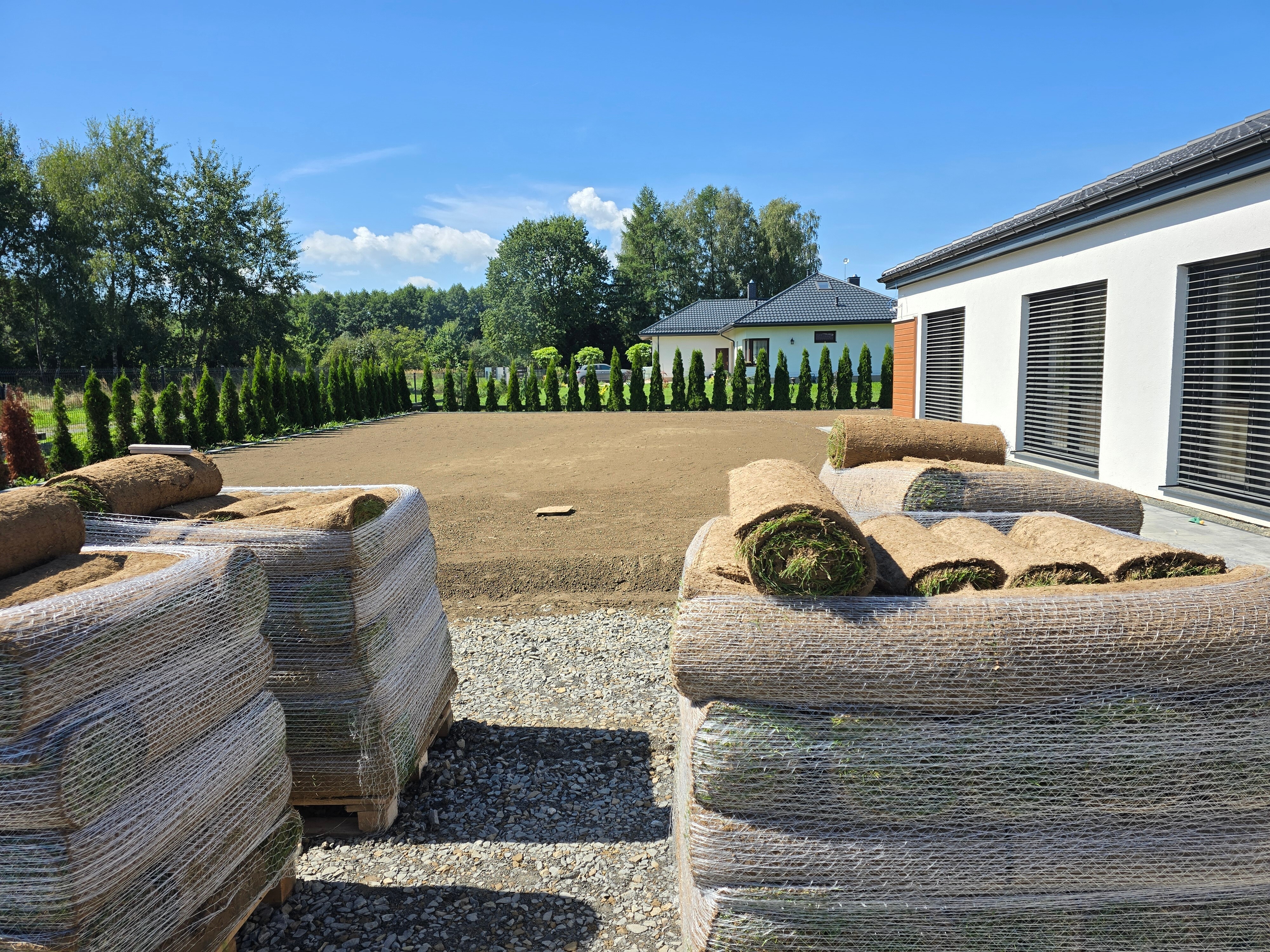 Następnie rozkładamy trawnik z rolki lub wysiewamy.